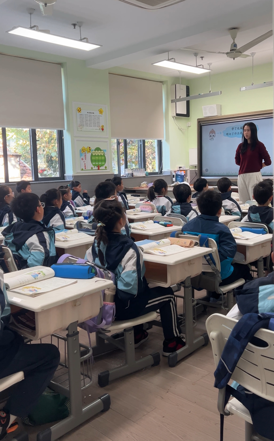 “学完了第13课《我要的是葫芦》,同学们有什么收获呢?来,手放背后,身体坐直!”在二(1)班,语文课临近尾声,班主任季智慧一边说,一边自然而然地把自己的双手背在身后,作为示范。这样的站姿,让这个本就高挑的00后姑娘,显得更加颀长挺拔。