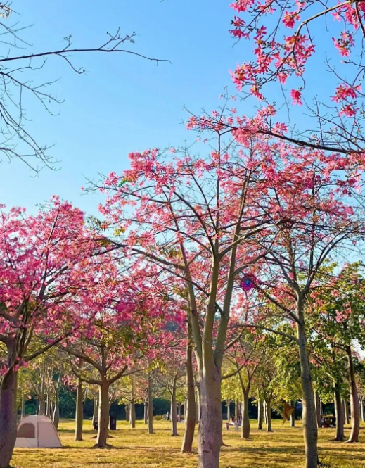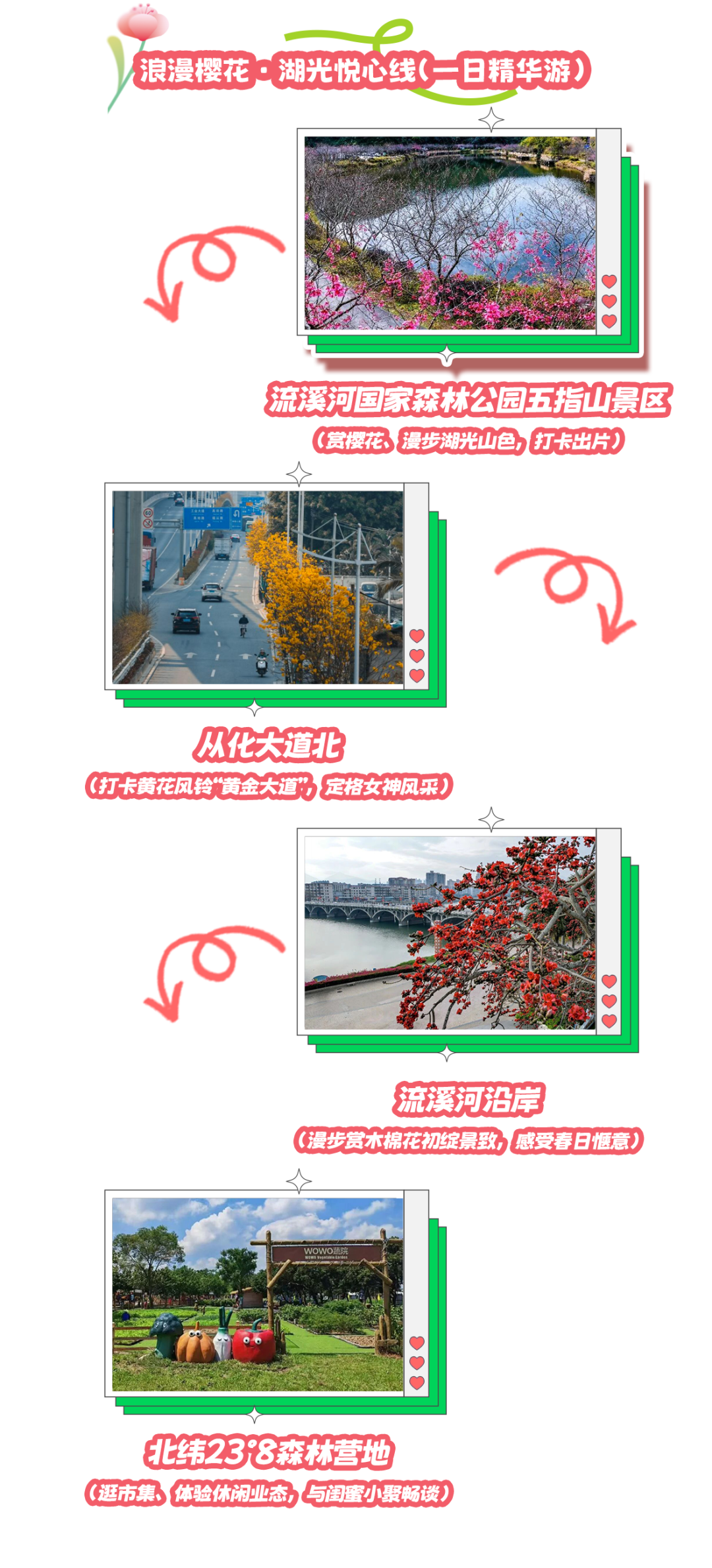 行程安排:流溪河国家森林公园五指山景区(赏樱花、漫步湖光山色,打卡出片)→从化大道北(打卡黄花风铃“黄金大道”)→流溪河沿岸(漫步赏木棉花初绽景致,感受春日惬意)→北纬23°8森林营地(逛市集、体验休闲业态,与闺蜜小聚畅谈)
