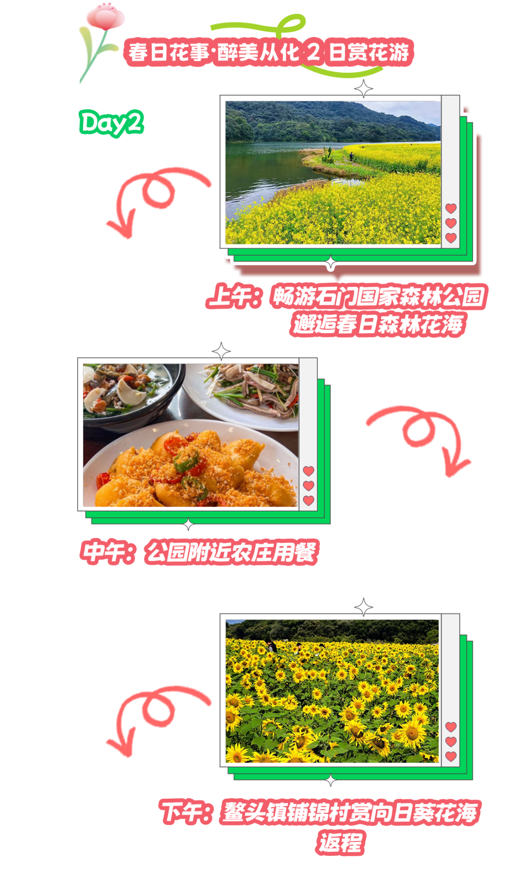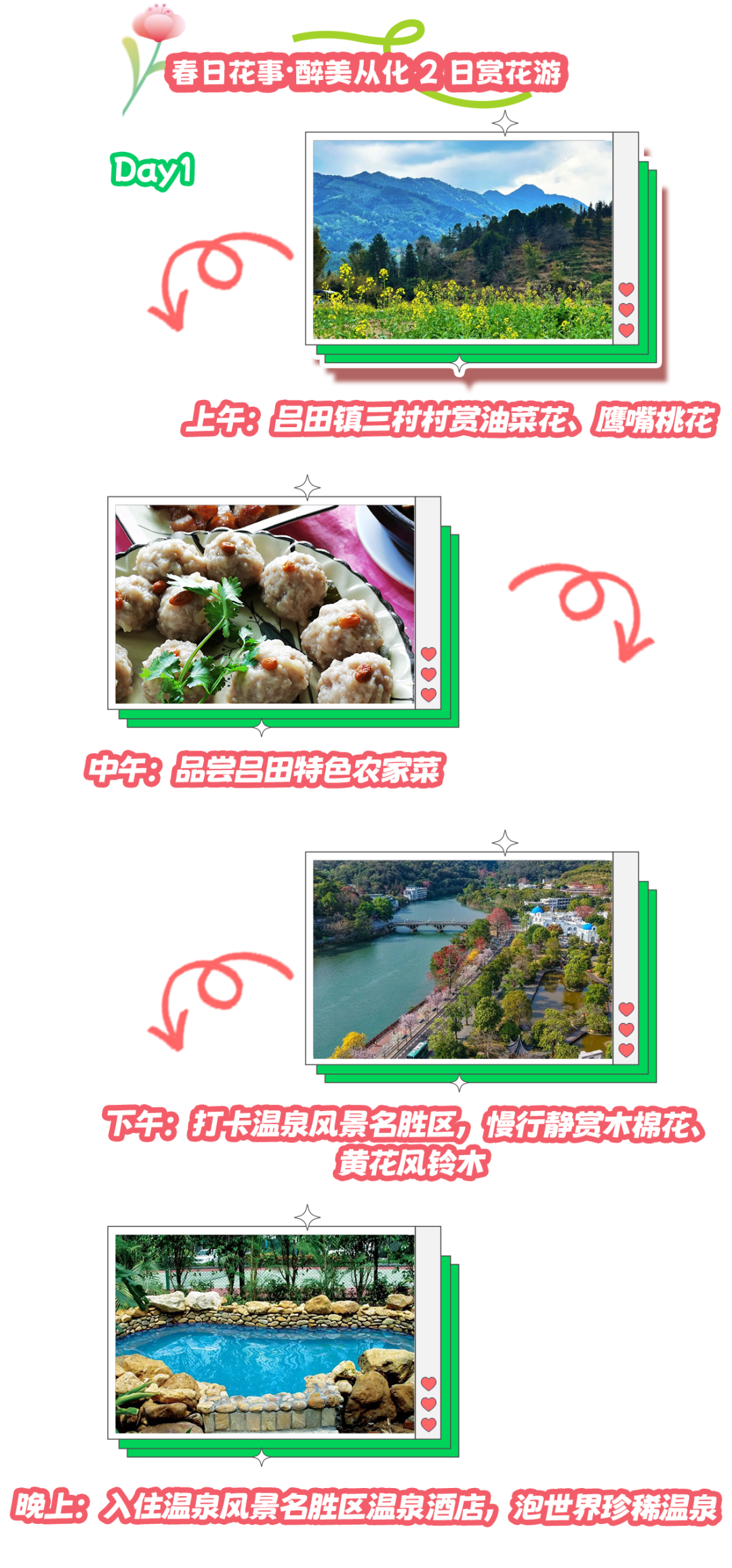 线路亮点:本线路为从化春季纯赏花专属动线,全程由北往南顺线打卡四大特色花海,无折返绕路。从吕田三村村油菜花与鹰嘴桃花双花争艳,到温泉风景名胜区,慢行静赏木棉花、黄花风铃木,再到石门国家森林公园的森林多元花海,最后邂逅鳌头铺锦村金色向日葵花海,春日景致各有韵味。赏花之余可入住温泉酒店舒缓身心,一站式饱览从化春日缤纷花景,是摄影采风、春日踏青的经典线路。
