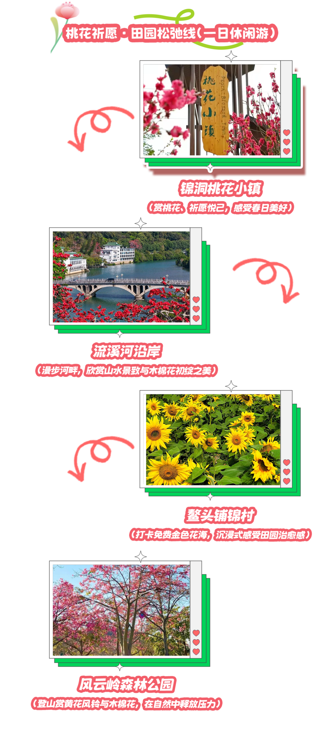 行程安排:锦洞桃花小镇(赏桃花、祈愿悦己,感受春日美好)→流溪河沿岸(漫步河畔,欣赏山水景致与木棉花初绽之美)→鳌头铺锦村(打卡免费金色花海,沉浸式感受田园治愈感)→风云岭森林公园(登山赏黄花风铃与木棉花,在自然中释放压力)