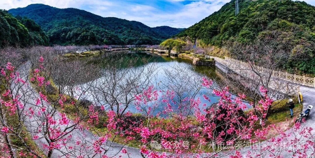 作为从化赏樱核心点位,景区月牙湖畔千株福建山樱(钟花樱)次第绽放,倒钟形的绯红花苞与澄澈湖水、苍翠山峦相映成趣,漫步樱花步道,微风拂过,花瓣轻舞,既能沉浸式感受高负氧离子的清新空气,也能在湖光山色间,邂逅樱花的浪漫与温柔,是拍照出片、舒缓身心的绝佳去处。